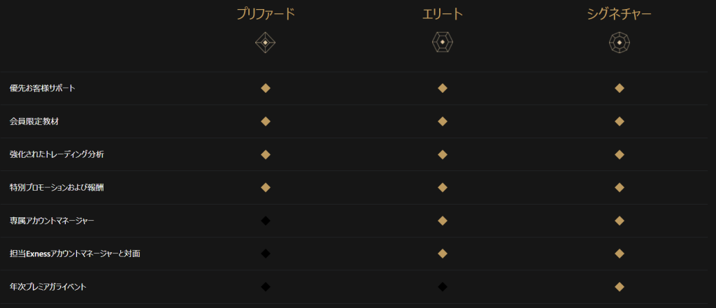 Exnessのプレミア制度は3つのランクに分かれています。