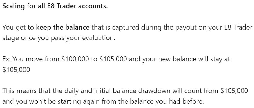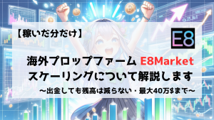 一般的なファームでは「原資の○%を稼ぐと、○%資金増大」と言うルールが基本ですが、E8Marketでは稼いだ分がそのまま自分の口座のスケーリングになるのです。