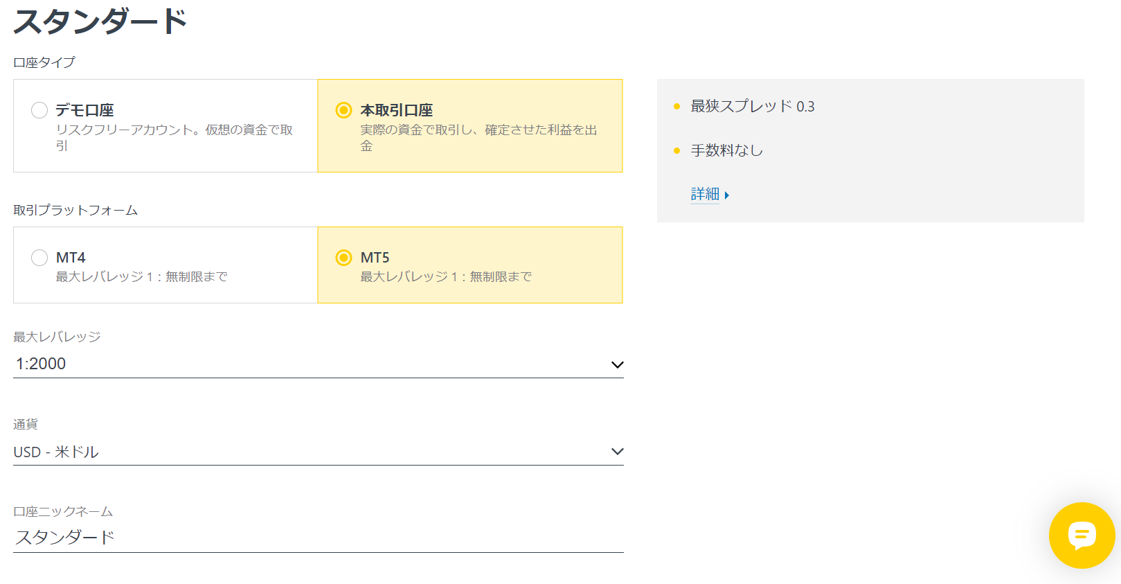 次に取引口座・取引プラットフォーム・最大レバレッジを選択します。
