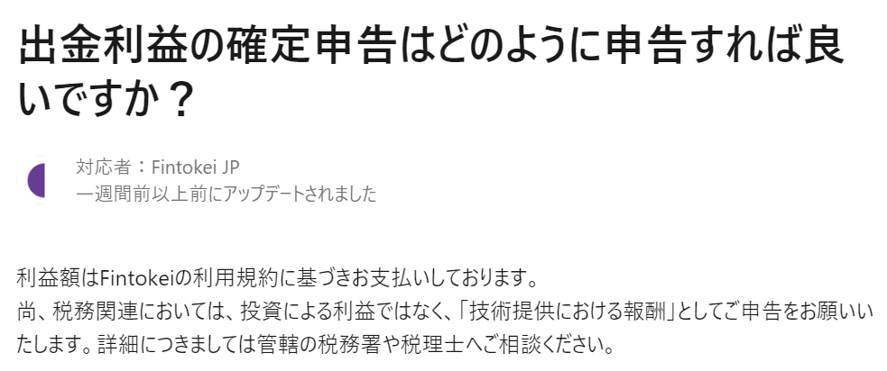 しかしFintokeiで発生した利益にかかる税金に関しては、公式から以下のような説明が出ています。