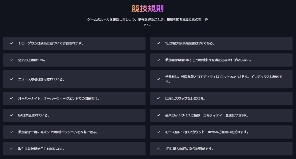 通常のプロップトレードの試験とあまり変わらない難易度ですが、赤字で書かれている部分がコンペで追加されるルールになります。