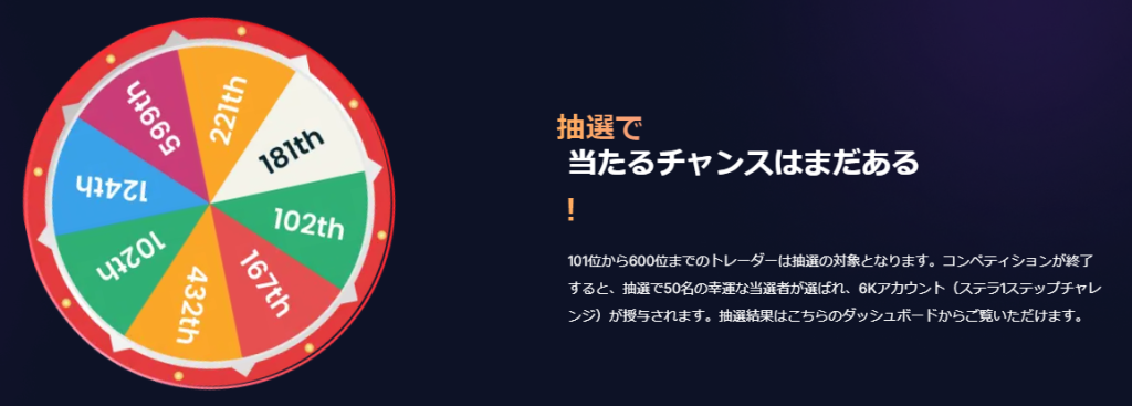 加えてFundedNextでは101位~600位までにも商品をもらえるチャンスがあります。抽選で50名の方にStellar1step6k口座がプレゼントされます。