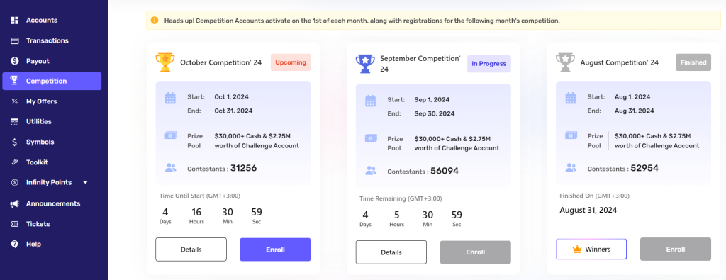 海外プロップファームのFundedNextでは、トレードコンペが毎月開催されています。日本市場のFintokeiに比べて市場規模がかなり大きいです。