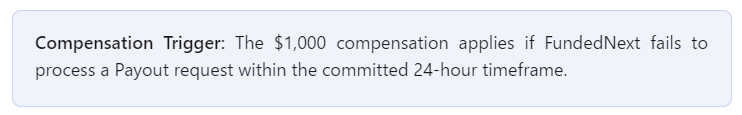 FundedNextの最大の強みは支払補償制度が搭載されていることです。支払い申請をしてから24時間以内に報酬が支払われなかった場合、1000$がプラスされます。