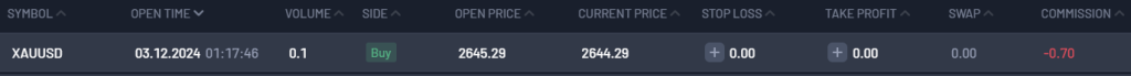 ゴールドを0.1lotトレードした際に、手数料で0.7ドル取られています。売却時には取られなかったですが実質1lotにつき7ドルです。(これはFXでも変わりません。)