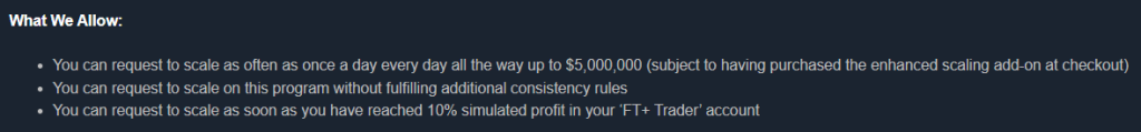FundedTradingPlusはプロ認定後のスケーリングの難易度が非常に簡単です。制限時間等は無く、「原資の10%以上の利益を獲得する」ことでスケーリング可能です。