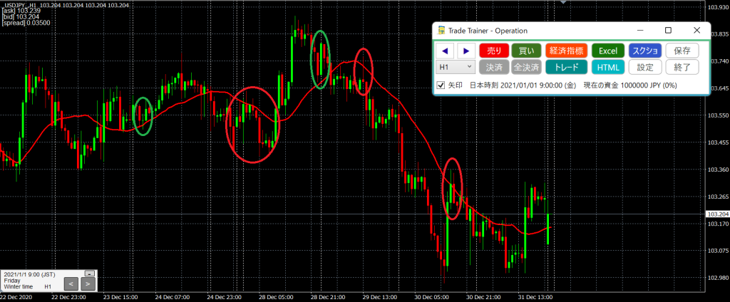 ※時間足は15分足・1時間足、移動平均線は21EMAとする。他の時間足でも使えると思うが、筆者は検証していないので注意。
