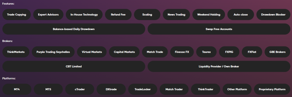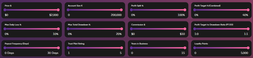 例えばチャレンジ料金を始めとした基本的な特徴に比べて、ファームの特徴やブローカー、トレードに使うプロップファームを選択して比較できます。