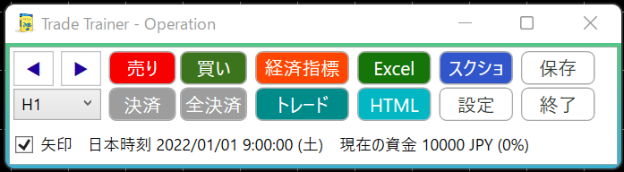 エントリーから経済指標の確認、ExcelやHTMLへのトレードデータ出力に加え経済指標の確認など検証に必要なものを全てボタン1つで確認できます。