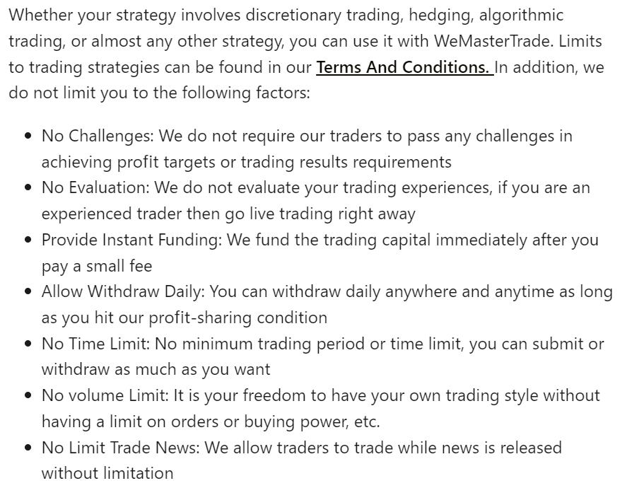 それでは実際にWeMasterTradeを使うメリットについて解説していきます。個人的にはプロップファームの中でも自由度に重きを置いているプロップファームです。