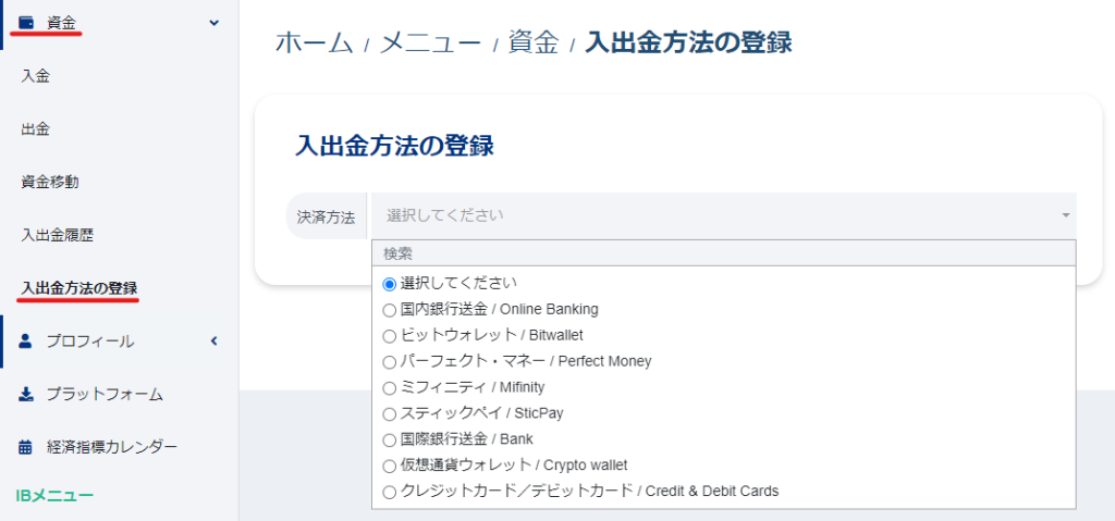 - XSのマイページから「資金⇒入出金方法の登録」に進む