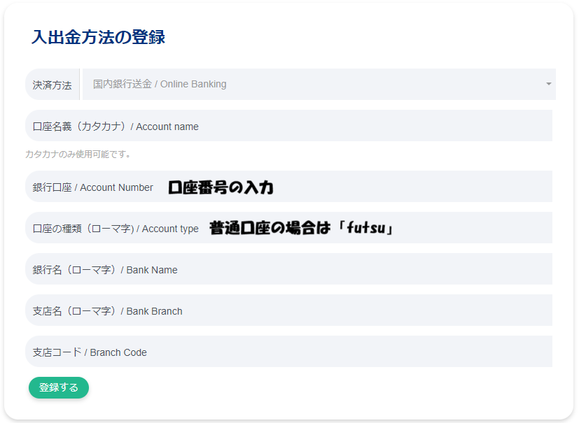 - 登録した出金先に情報を入力していく